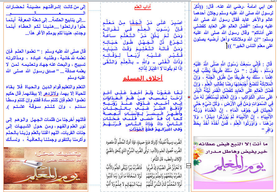 مطويات عن يوم المعلمه. إلى معلمتي التي ينتابني الحزن عندما أذكر أنني سافارق هذه المدرسة وتكون هي من بين معلماتها. المطويات نماذج ورقية مطويات جاهزة اشكال مطويات مطويات فارغة مطويات اسلامية مطويات تربوية مطويات رياضيات مطويات عن النظافة مطويات عن اليوم الوطني 1436. المعلم هو الأب الثاني لنا وهنا لكم في مقالي هذا عبارات عن يوم المعلم أتمنى أن تنال أعجابكم. مطويات عن عيد المعلم جاهزة للطباعة نشرات عن يوم المعلم اذاعة عن يوم المعلم س ئل أكتوبر 5 2017 بواسطة ejabty تم الإظهار مرة أخرى سبتمبر 17 بواسطة إجابتي.